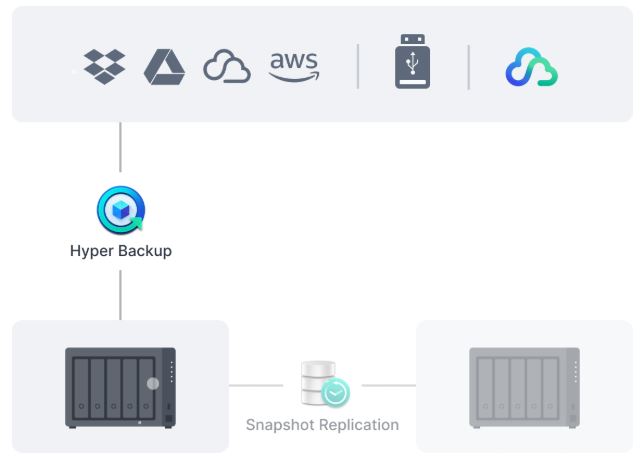 PomocĂ komplexnĂch plánovanĂ˝ch záloh, vÄŤetnÄ› ĂşplnĂ©ho zálohovánĂ systĂ©mu, do mĂstnĂch a vzdálenĂ˝ch serverĹŻ, externĂch diskĹŻ nebo cĂlĹŻ v cloudovĂ˝ch ĂşloĹľištĂch, vÄŤetnÄ› sluĹľby Synology C2 Storage, mĹŻĹľete chránit všechna data, aplikace a konfigurace svĂ˝ch systĂ©mĹŻ Synology.