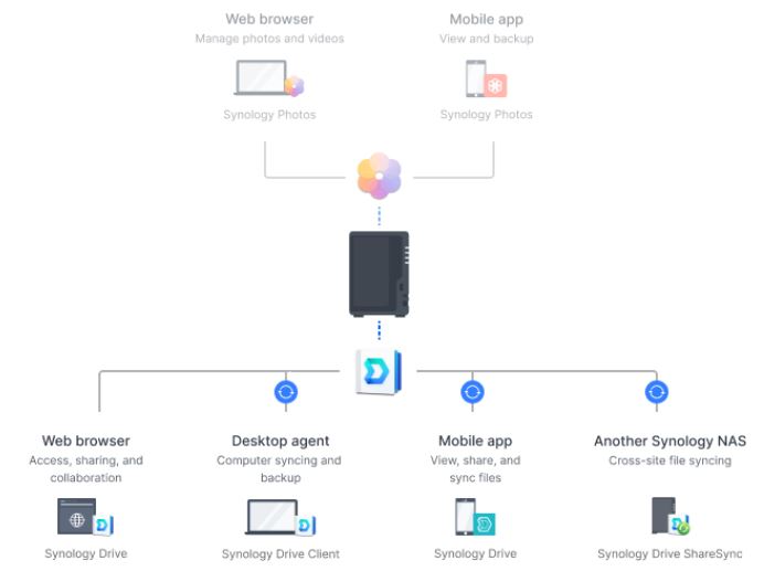 Kompaktní 2-pozicové NAS řešení navržené pro centralizaci správy dat, nabízející komplexní sadu nástrojů prostřednictvím Synology DiskStation Manager (DSM) pro správu, sdílení a ochranu souborů a fotografií, zálohování zařízení a dat a sloužící jako jádro chytrého dohledového systému.