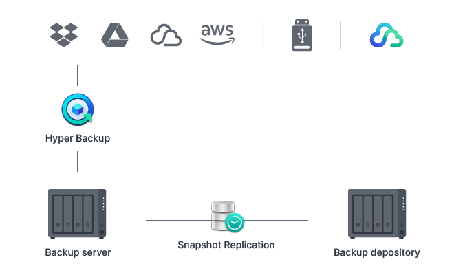Pomocí řešení Synology můžete zálohovat všechna data uložená v zařízení DS423 do sekundárního serveru, externího úložného zařízení nebo do cloudu.