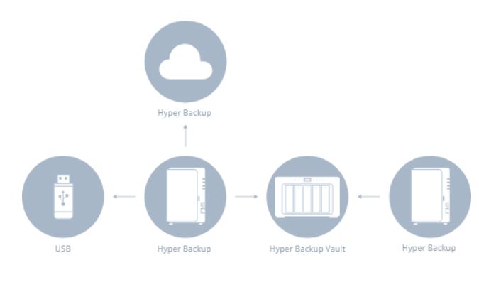 Komplexní řešení zálohování a obnovení posiluje ochranu dat. Cíle záloh lze vytvářet lokálně, na jiném zařízení Synology, na serverech rsync nebo v cílech v cloudu, například ve službách Google Drive nebo Dropbox, v cílech kompatibilních se službou S3 a ve službě Synology C2 Storage, cíli záloh vyhrazeném pro zařízení Synology. Deduplikace, kontroly integrity a technologie přírůstkového přenosu omezují šířky pásma a snižují využití úložiště.