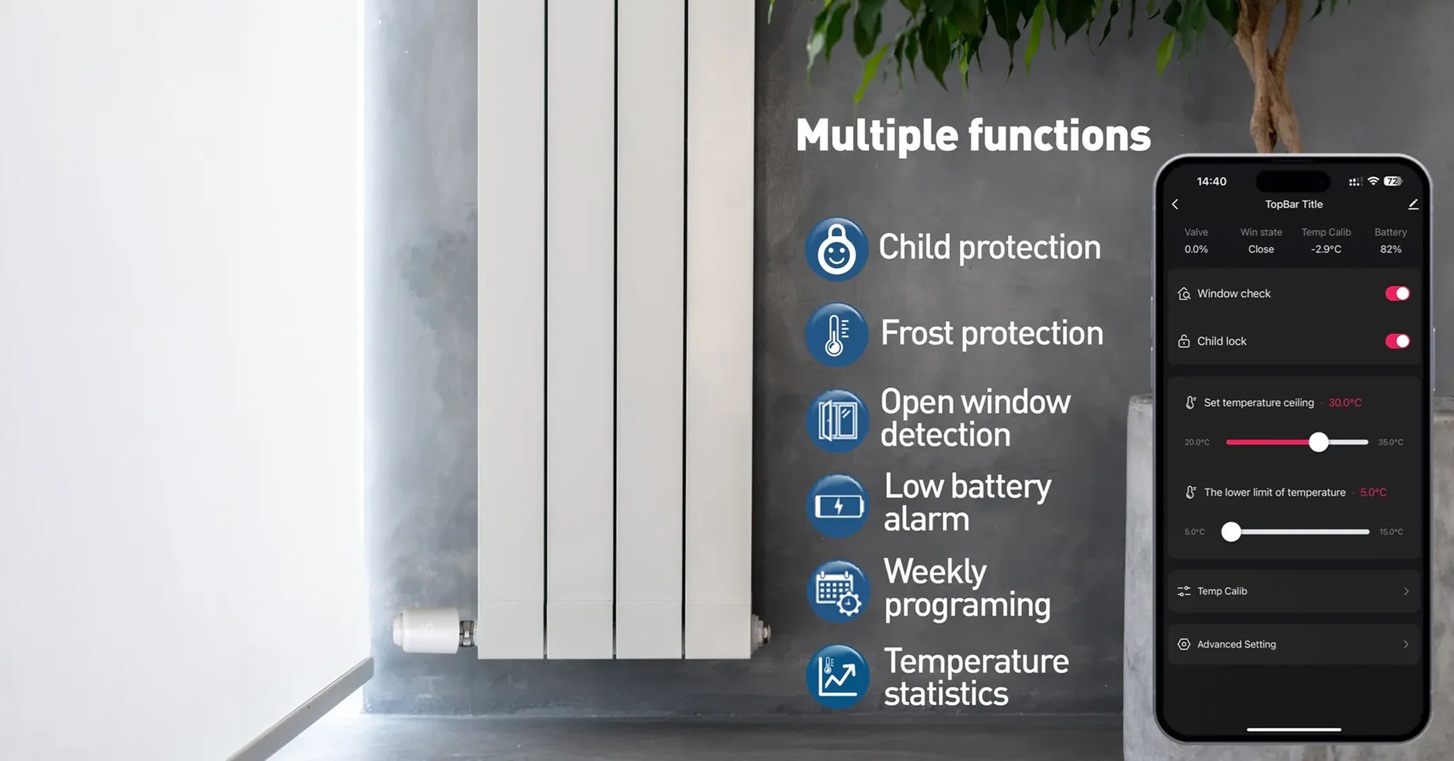 Více funkcí: dětská ochrana, protimrazová ochrana, periodické odvápnění, detekce otevřeného okna, alarm slabé baterie