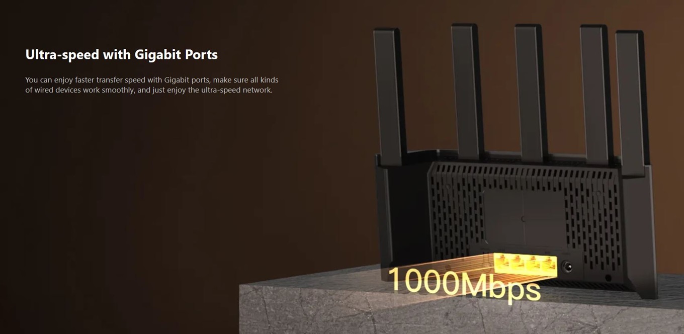 - Stabilní připojení a pokrytí - díky podpoře MU-MIMO a OFDMA je možné připojit více zařízení při zachování plné stability signálu, navíc technologie Beamforming a pět 6 dBi antén zajišťují rozsáhlé pokrytí