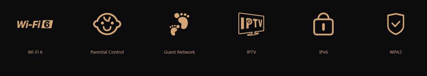 Dvoupásmový Gigabitový Wi-Fi+ 6 (AX1500) Mesh router 802.11 ax/ac/a/b/g/n, zabezpečení WPA3, SMART CZ aplikace, 1x GWAN, 3x GLAN, 5x anténa 6 dBi, až 1501 Mb/s (2,4GHz 300 Mb/s + 5GHz 1201 Mb/s), IPv6, Universal Repeater, AP mode, MU-MIMO + OFDMA, Beamforming.