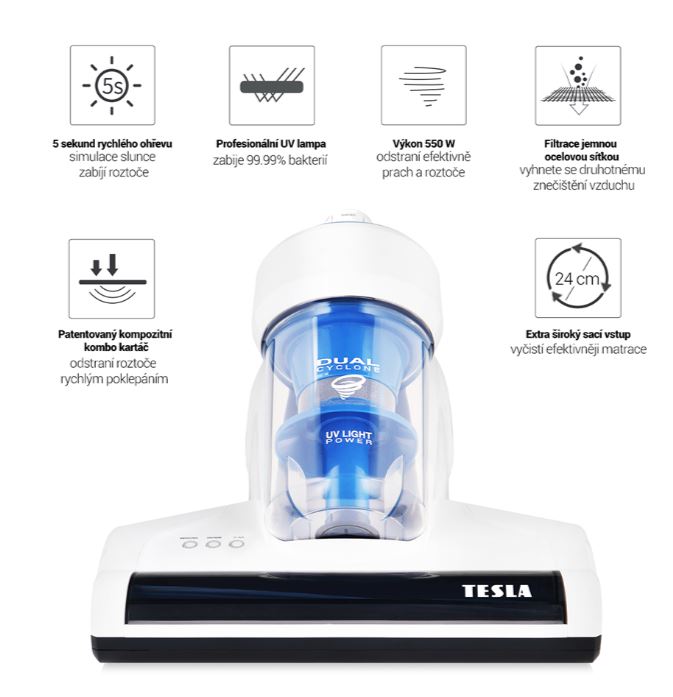TESLA LifeStar UV550 si pĹ™i ÄŤištÄ›nĂ poradĂ s hluboko usazenĂ˝m prachem, zvĂĹ™ecĂ srstĂ a jinĂ˝mi neÄŤistotami. VĂ˝konná UV-C lampa a horkĂ˝ vzduch zniÄŤĂ 99.9% bakteriĂ, alergenĹŻ a roztoÄŤĹŻ, sterilizuje matrace, polštáře, ÄŤalounÄ›nĂ a sniĹľuje tak riziko vzniku astmatu a koĹľnĂch onemocnÄ›nĂ. RotaÄŤnĂ turbo kartáč pronikne hluboko do vláken textilu a efektivnÄ› odstranĂ nežádoucĂ mikroorganismy.