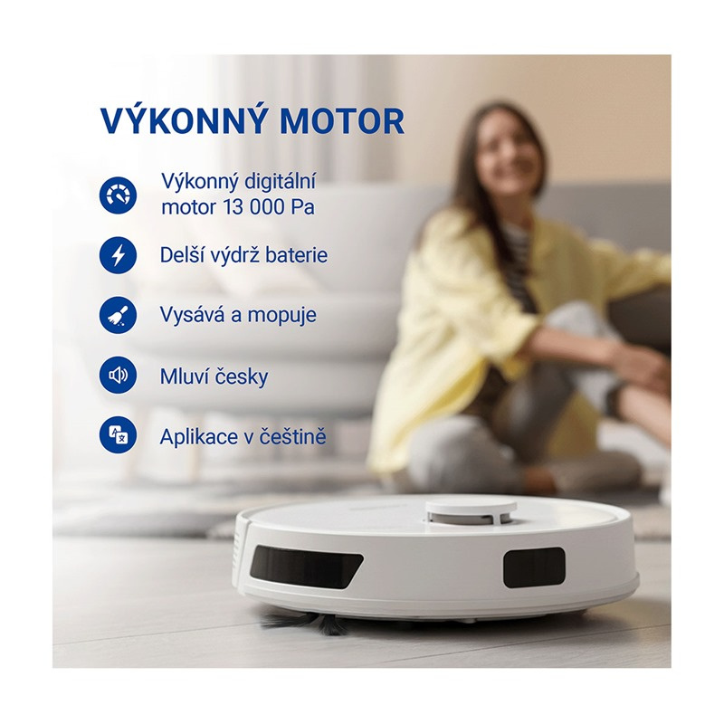 Robotický vysavač je vybaven silným 13 000 Pa sacím digitálním motorem. Inteligentní řízení výkonu, se postará o automatickou regulaci sacího výkonu. Pokud senzory detekují koberec, automaticky se zvýší sací výkon pro hloubkové čištění koberců.