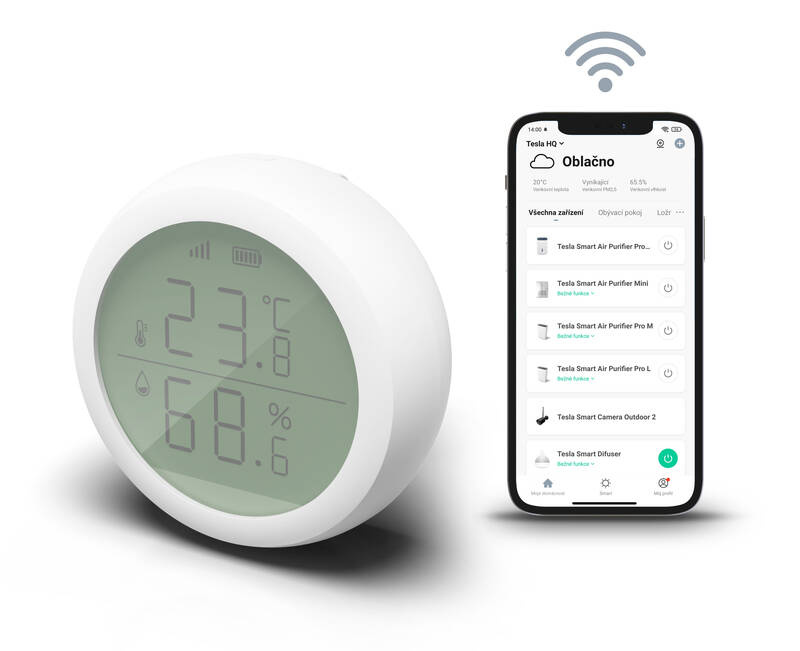 Senzor funguje jako čidlo, které neustále monitoruje své okolí. Naměřenou teplotu a vlhkost zobrazuje přehledně přímo na displeji a zároveň posílá data do mobilní aplikace ve vašem telefonu.