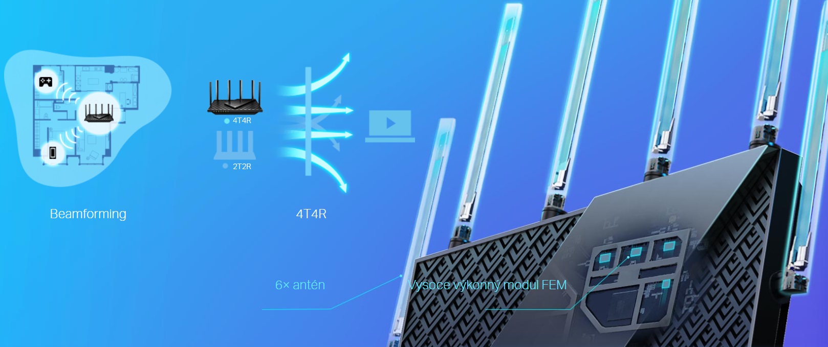 Dopřejte si stabilní Wi-Fi připojení i v kuchyni nebo ložnici. Vysoce výkonný modul FEM, 6 antén, technologie Beamforming a provedení 4T4R společně přizpůsobují pokrytí Wi-Fi sítě tak, aby perfektně vyhovovala vašim domácím potřebám a síla signálu byla soustředěna směrem k vašim zařízením.