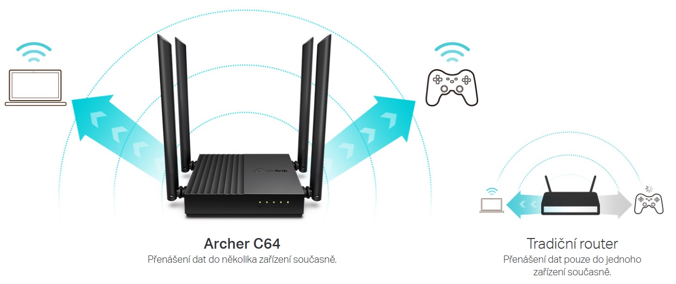 Čtyři antény poskytují stabilní bezdrátové připojení a optimální pokrytí. Snadnou správu sítě máte po ruce díky aplikaci TP-Link Tether. Technologie MU-MIMO dosahuje dvojnásobné účinnosti – komunikuje až se 2 zařízeními současně.