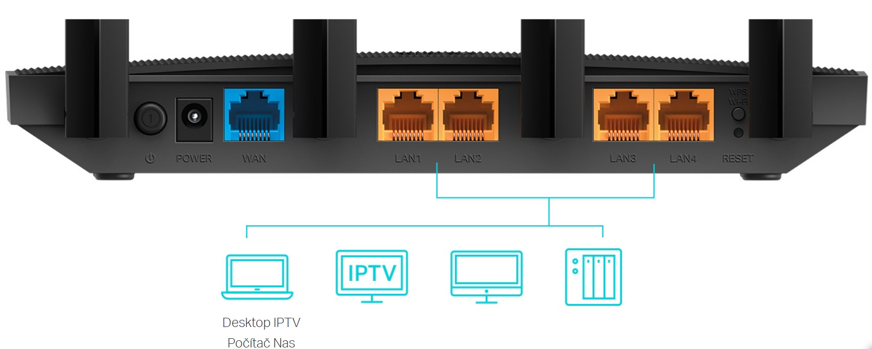Gigabitové ethernetové porty (1 WAN + 4 LAN) poskytují maximální rychlost připojení. Zapojte své počítače, chytré televizory a herní konzole pro rychlé a spolehlivé připojení.