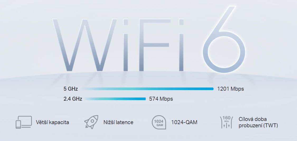 *Dvoupásmová WiFi 6: Rychlost až 3000 Mb/s - 2402 Mb/s na frekvenci 5 GHz a 574 Mb/s na frekvenci 2,4 GHz.