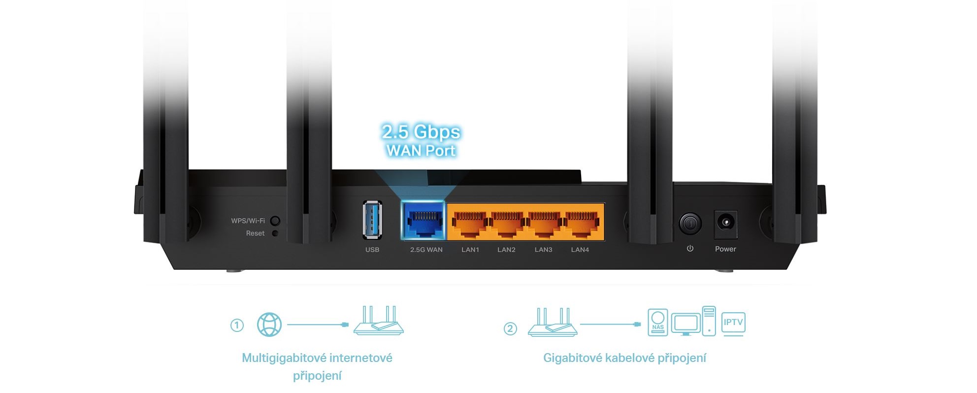Překonejte omezenou průchodnost technologie 1 Gbit/s a naplno využijte svůj širokopásmový tarif s rychlostí až 2,5 Gbit/s u datových přenosů přes port 2.5G WAN. Zapojte své počítače, chytré televizory nebo herní konzole do jednoho ze čtyř gigabitových ethernetových LAN portů a vybavte je rychlým a spolehlivým kabelovým připojením.
