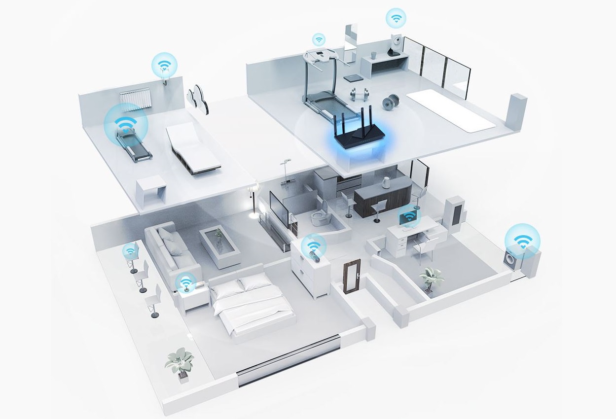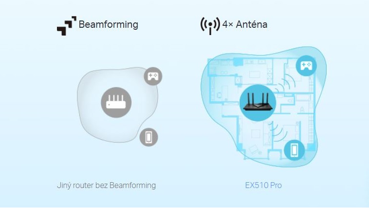 Technologie Beamforming a antény s vysokým ziskem společně přizpůsobují pokrytí Wi-Fi sítě tak, aby perfektně vyhovovala vašim domácím potřebám a síla signálu byla soustředěna směrem ke každému zařízení.