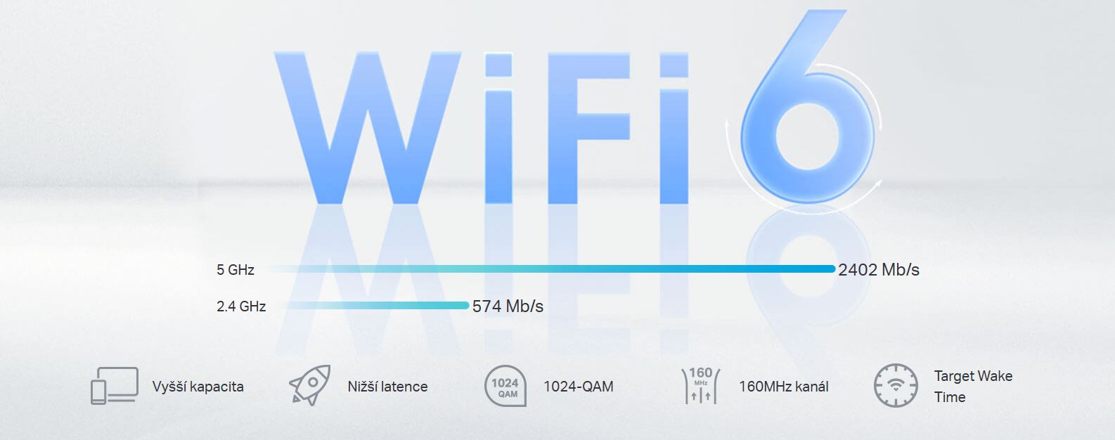 *Dvoupásmová WiFi 6: Rychlost až 3000 Mb/s - 2402 Mb/s na frekvenci 5 GHz a 574 Mb/s na frekvenci 2,4 GHz.