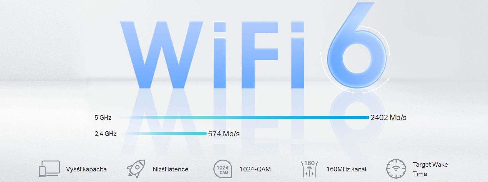 *Dual-Band Wi-Fi 6: Rychlosti až 3000 Mb/s—2402 Mb/s na 5 GHz a 574 Mb/s na 2,4 GHz.