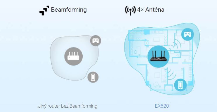 *Rozšířené pokrytí: Čtyři vysoce výkonné antény a technologie Beamforming zajišťují silné a spolehlivé WiFi pokrytí po celém domě.
