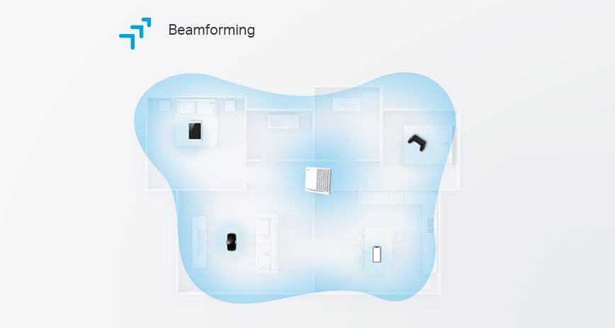 Technologie Beamforming a antény s vysokým ziskem společně přizpůsobují pokrytí Wi-Fi sítě tak, aby perfektně vyhovovala vašim domácím potřebám a síla signálu byla soustředěna směrem ke každému zařízení.