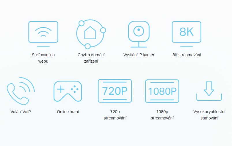 *Více připojených zařízení: Technologie OFDMA a MU-MIMO zvyšují kapacitu a umožňují současný přenos na více zařízení.