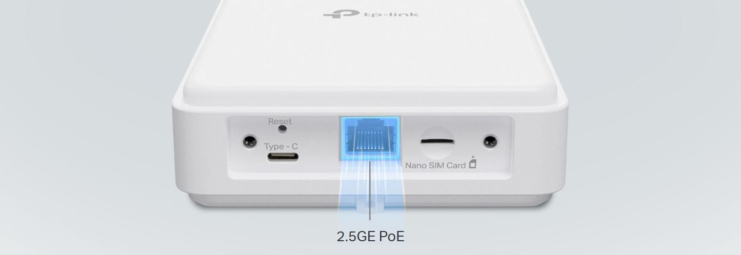 Porty: 1× 2.5Gbps PoE/LAN, 1× Nano SIM slot, 1× USB-C (pro debug)