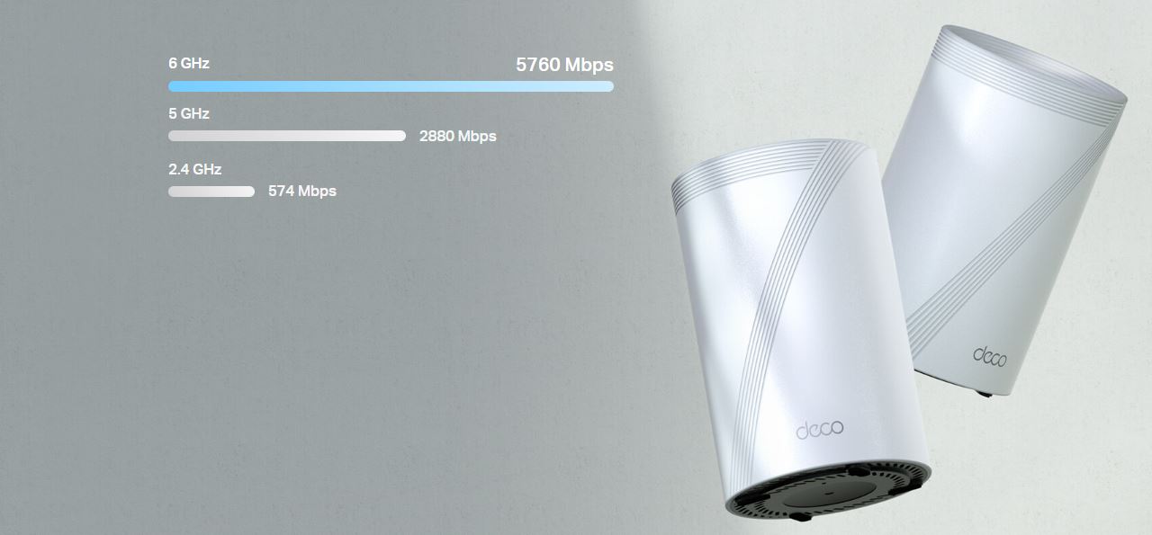 Wi-Fi 7 naplno využívá potenciál technologie 4K-QAM a pásma 6 GHz s kanály o šířce až 320 MHz a poskytuje bezprecedentní rychlost Wi-Fi až 9214 Mb/s. Nové pásmo 6 GHz poskytuje výjimečnou šířku pásma bez přetížení kanálů.