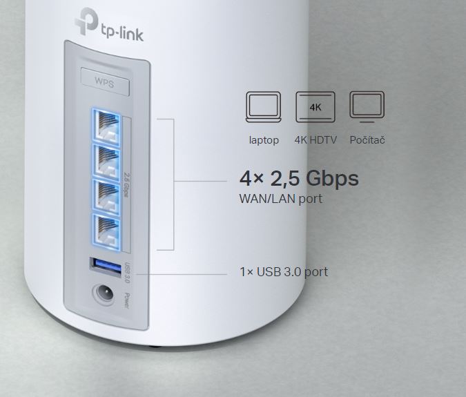 4× 2,5 Gb/s porty maximalizují rychlost domácího internetu s až 2,5× vyšší kabelovou rychlostí než typický gigabitový ethernetový port. Díky dodatečnému portu USB 3.0 je Deco BE65 ideálním řešením pro budoucnost vaší domácí sítě. Připojte svá oblíbená kabelová zařízení k Deco BE65 a nechte se ohromit.