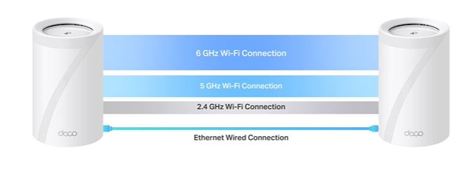 Díky naší vlastní vyvinuté technologii dokáže Deco BE65 připojit bezdrátový a kabelový backhaul s každou jednotkou současně. A co víc, díky nejnovější technologii WiFi 7 MLO se zvyšuje rychlost kombinované agregace bezdrátového a kabelového backhaulu systému. Tím se výrazně zlepšuje celková propustnost a snižuje latence, což přináší širší pokrytí se stabilnějším a spolehlivějším připojením.