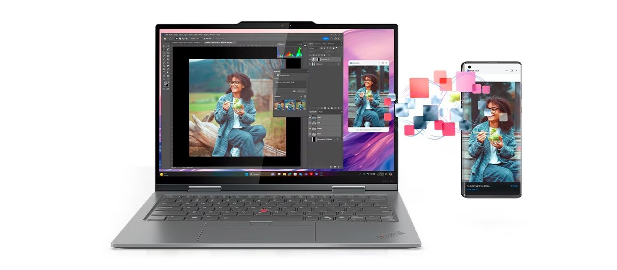 Funkce Smart Share okamžitě propojí váš chytrý telefon s notebookem prostřednictvím virtuálního snímače s umělou inteligencí. Stačí klepnout na zařízení se systémem Android™ nebo iOS a přetáhnout je na notebook. Upravujte fotografie a snadno je sdílejte. Navíc získejte přístup k textovým zprávám a posílejte je z počítače.