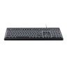 Tato tichá klávesnice je vybavena LED podsvícenými klávesami pro snadnou čitelnost bez ohledu na denní dobu. Jas si můžete přizpůsobit pomocí kláves Fn tak, aby vyhovoval vašemu prostředí. Design odolný proti polití chrání klávesnici před tekutinami, zatímco nastavitelné nožičky vám umožní najít ideální úhel pro psaní. Jednoduše připojte klávesnici pomocí USB-C kabelu nebo přiloženého adaptéru USB-C na USB-A a můžete začít používat.