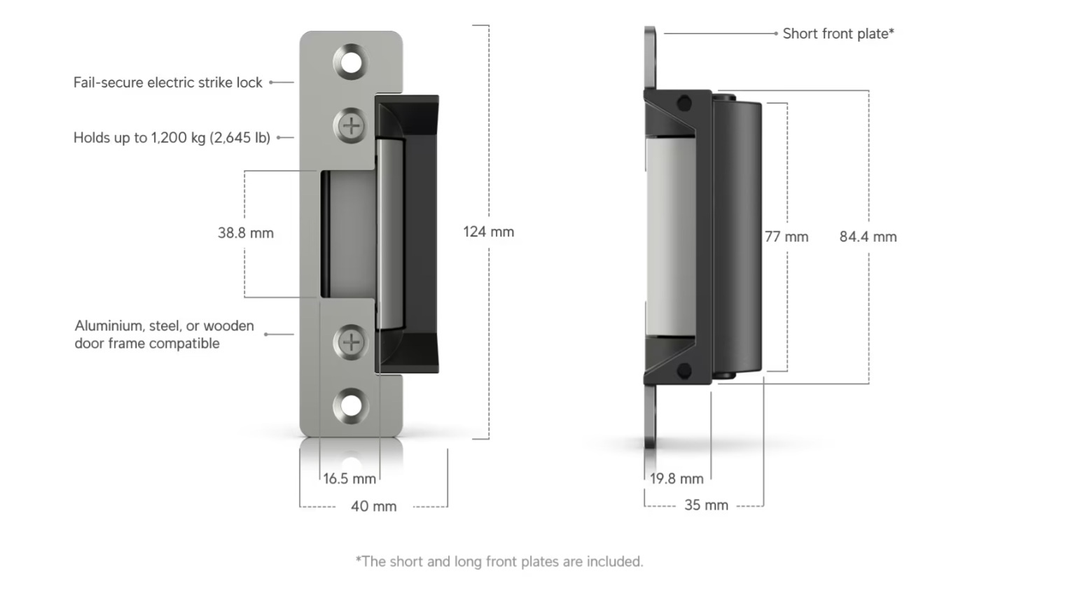 *Rozměry: Tělo zámku: 80 × 40 × 35 mm; krátká čelní deska: 124 × 32 × 3 mm; dlouhá čelní deska: 202 × 36 × 3 mm