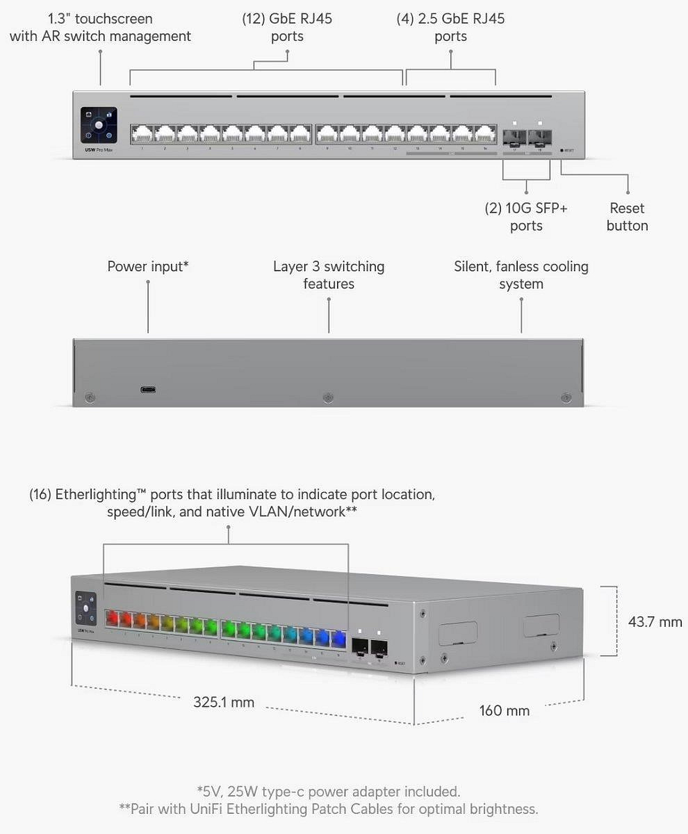Popis produktu Ubiquiti Pro Max 16 je novým L3 switchem, který nabízí 4x 2.5 Gbps a 12x 1 Gbps porty. Pro připojení pomocí optického rozhraní jsou připraveny 2 SFP+ porty dosahující rychlosti až 10 Gb/s. Switch je napájen přes USB-C konektor 5V DC 25W. Etherlighting technologie Switch podporuje technologii Etherlighting, která umožňuje barevně indikovat lokaci portu, linkovou rychlost, nadefinované typy zařízení, PoE status nebo barevně odlišit jednotlivé VLAN. *pro správnou funkci je doporučeno použít Ubiquiti UniFi Etherlighting Patch kabely Správa přes UniFi Controller Switch nemá webový management, ale je spravován centrálně pomocí UniFi Controlleru s podporou mobilní aplikace UniFi a nabízí rozsáhlou sadu pokročilých přepínacích protokolů a funkcí L2, včetně provozního režimu (přepínání, zrcadlení nebo agregace) na port. UniFi Network Controller a mobilní aplikace umožňují správcům konfigurovat a sledovat prakticky všechny funkce přepínače v grafickém uživatelském rozhraní odkudkoli. Obsah balení • Zařízení • Napájecí DC adaptér • Montážní set Kontakt: Ubiquiti International Holding B.V. Ekkersrijt 3102, 5692 CC Son en Breugel support@ui.com Technická podpora k tomuto produktu je dostupná na emailu rma@discomp.cz, telefonním čísle (+420) 377 477 794, případně odesláním dotazu přes webový formulář. Naše technická podpora je dostupná v této pracovní době. Obchodní informace Dan Pacanda, +420 370 380 965 , dan.pacanda@discomp.cz Technické parametry Konektory a rozhraní Rychlost LAN:(12) 10/100/1000Mbps + (4) 10/100/2500Mbps Optické rozhraní:(2) 1G/10Gbps Ostatní:Dotykový displej Napájení Typ napájení:USB-C Max. spotřeba energie [W]:25 Napájení přes konektor/svorkovnici:5V DC Fyzické charakteristiky Provedení:Na zeď, Desktop, Rackmount Ventilátory:Ne Šasi:Kovové Tlačítka:Reset Provozní teplota [°C]:-5 až 40 Šířka [mm]:325 Výška [mm]:44 Hloubka [mm]:160 Obecné Rychlost přepínání [Gbps]:84 Rychlost předávání paketů [Mpps]:62 Software Management:UniFi Network Funkce:VLAN, DHCP snooping, L3 Výchozí IP adresa:Dynamická z DHCP.