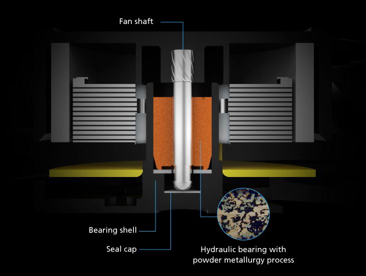 NovĂ© loĹľisko MHD je vybaveno loĹľiskem Hydro Dynamic s vylepšenou technologiĂ práškovĂ© metalurgie. Technologie loĹľisek MHD vyuĹľĂvá zvýšenou kapacitu oleje, která zlepšuje mazánĂ loĹľiska a nabĂzĂ plynulejšà otáčenĂ. Vylepšená distribuce oleje vytvářà maximálnĂ plynulost, která prodluĹľuje Ĺľivotnost a spolehlivost ventilátoru aĹľ na 40 000 hodin a sniĹľuje hluÄŤnost ventilátoru.