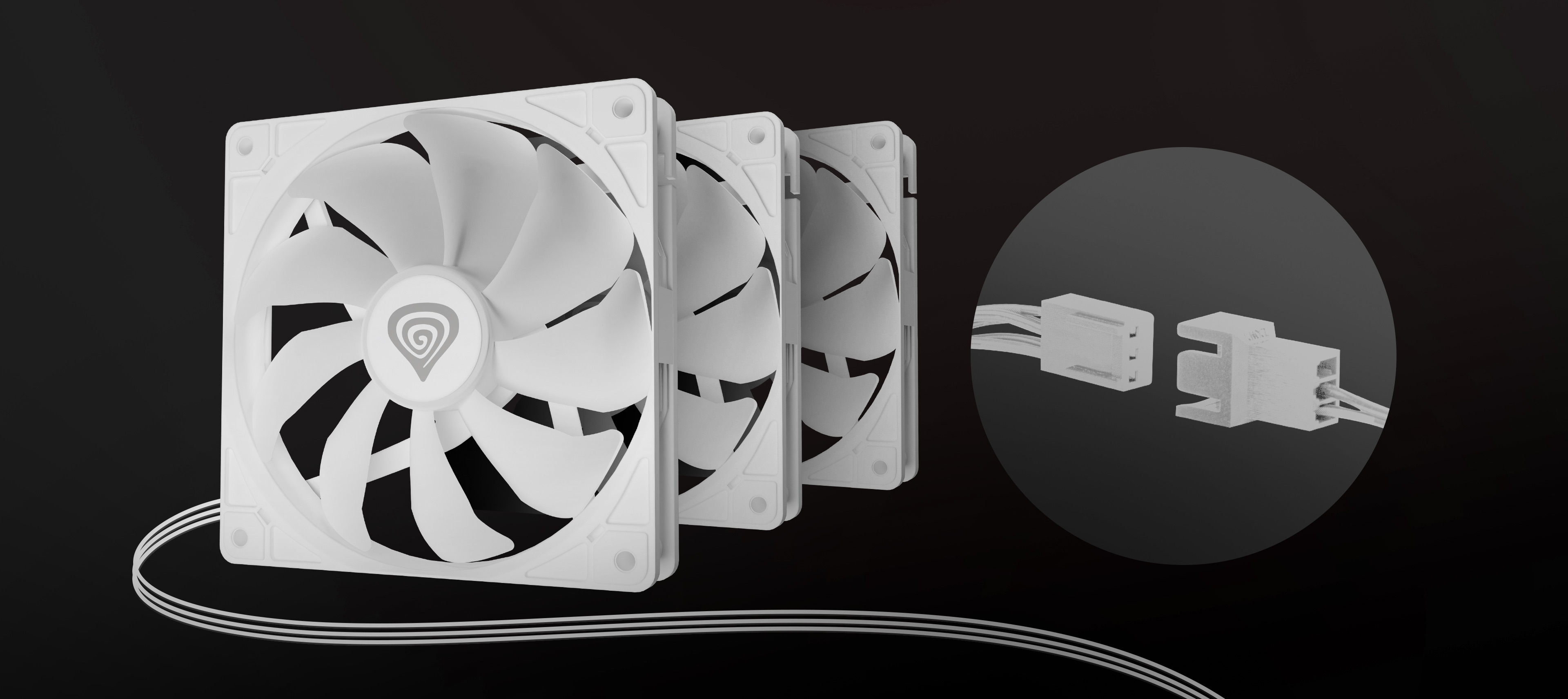 GENESIS Oxal 120 ARGB je vybaven 3pólovým konektorem s konektorem samec a samice. To vám umožní připojit ventilátor přímo k základní desce a pomocí něj ovládat nejen podsvícení, ale také otáčky, například v závislosti na aktuální teplotě procesoru, a tím to zdaleka nekončí. Díky oboustrannému konektoru lze snadno připojit několik ventilátorů dohromady a zapojit je do jedné zásuvky, což usnadňuje udržování pořádku uvnitř skříně.