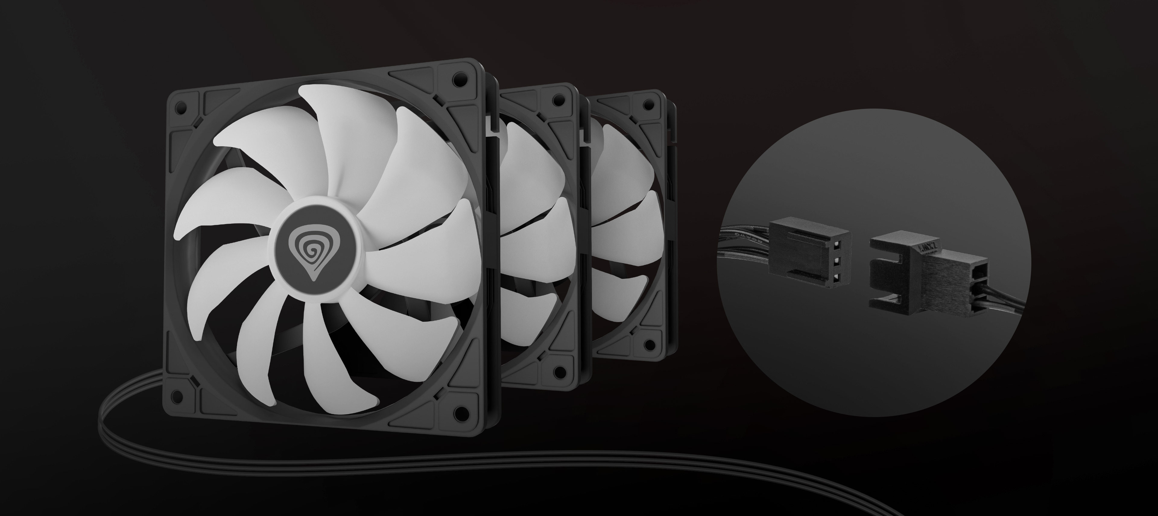 GENESIS Oxal 120 ARGB je vybaven 3pólovým konektorem s konektorem samec a samice. To vám umožní připojit ventilátor přímo k základní desce a pomocí něj ovládat nejen podsvícení, ale také otáčky, například v závislosti na aktuální teplotě procesoru, a tím to zdaleka nekončí. Díky oboustrannému konektoru lze snadno připojit několik ventilátorů dohromady a zapojit je do jedné zásuvky, což usnadňuje udržování pořádku uvnitř skříně.