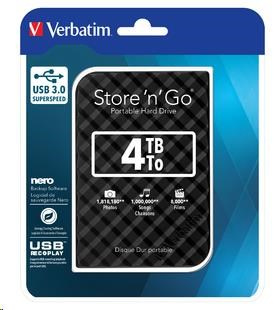 VERBATIM HDD 2.5" 4 TB Store 'n' Go Portable Hard Drive USB 3.0, Black Special Features: Colours available: Black, Silver, White, Red & Blue Capacities available: 500GB, 1TB & 2TB High speed, high capacity storage. A fast & safe solution to expand storage or backup files USB 3.0 SuperSpeed - for ultra fast data transfer Nero Backup Software Energy Saving Software USB REC & PLAY* - supports USB recording/ playback 2 year limited warranty** System requirements: PC or Mac with USB 3.0 Windows XP / Vista / Windows 7 & 8 Mac OS X 10.4 or higher Pack Contents: Portable Hard Drive / USB 3.0 Cable / Nero Backup Software / Green Button Energy Saving Software / Verbatim Formatter / Quick Start Guide / User Guide (pre-loaded on the drive).