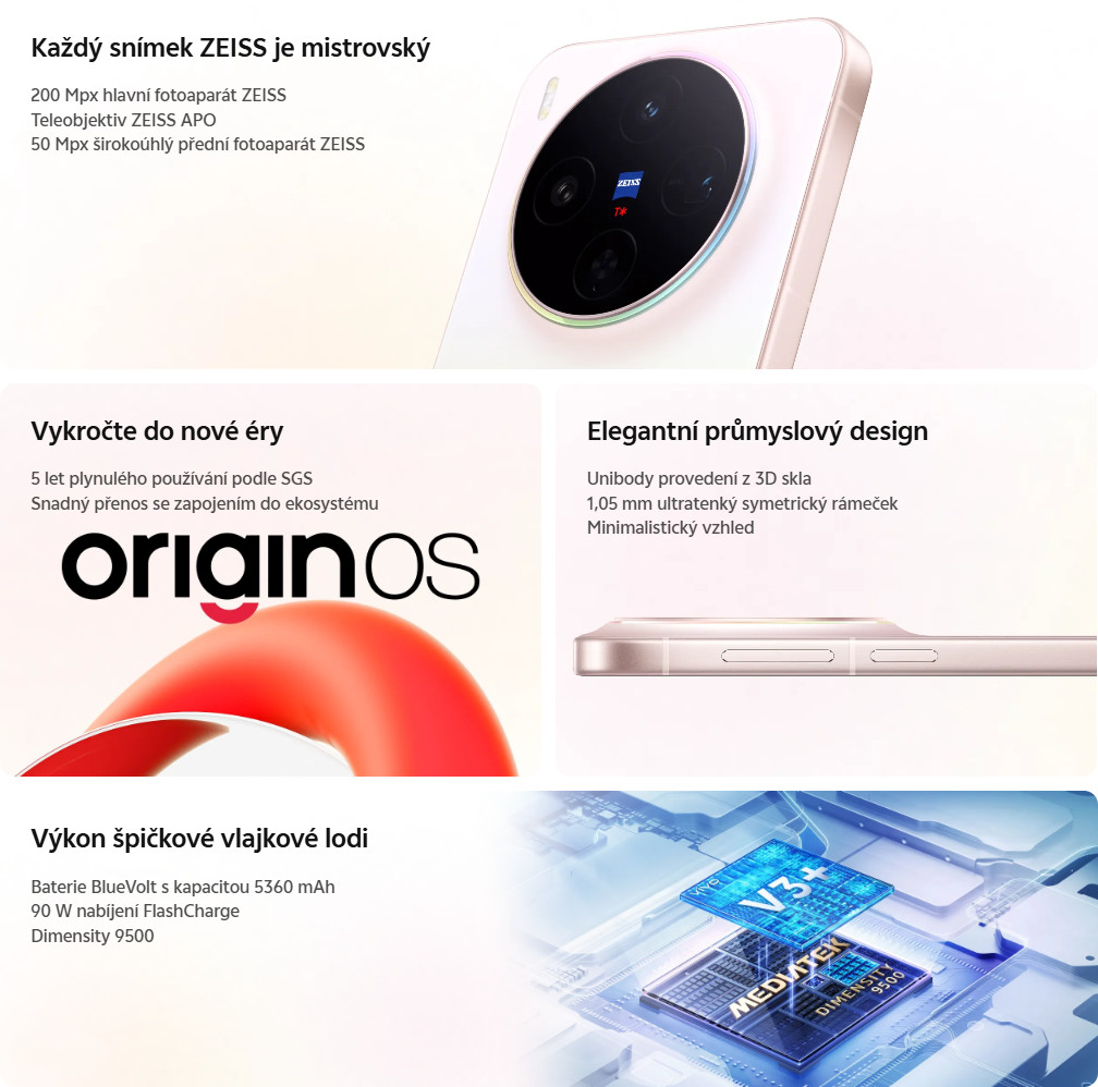 Procesor Dimensity 9500 s integrovanĂ˝m ÄŤipem V3+, vyvinutĂ˝ ve spolupráci MediaTeku a laboratoĹ™e vivo Arm Joint Lab, nabĂzà špiÄŤkovĂ˝ vĂ˝kon s optimalizovanou spotĹ™ebou a nezastavitelnou rychlostĂ.