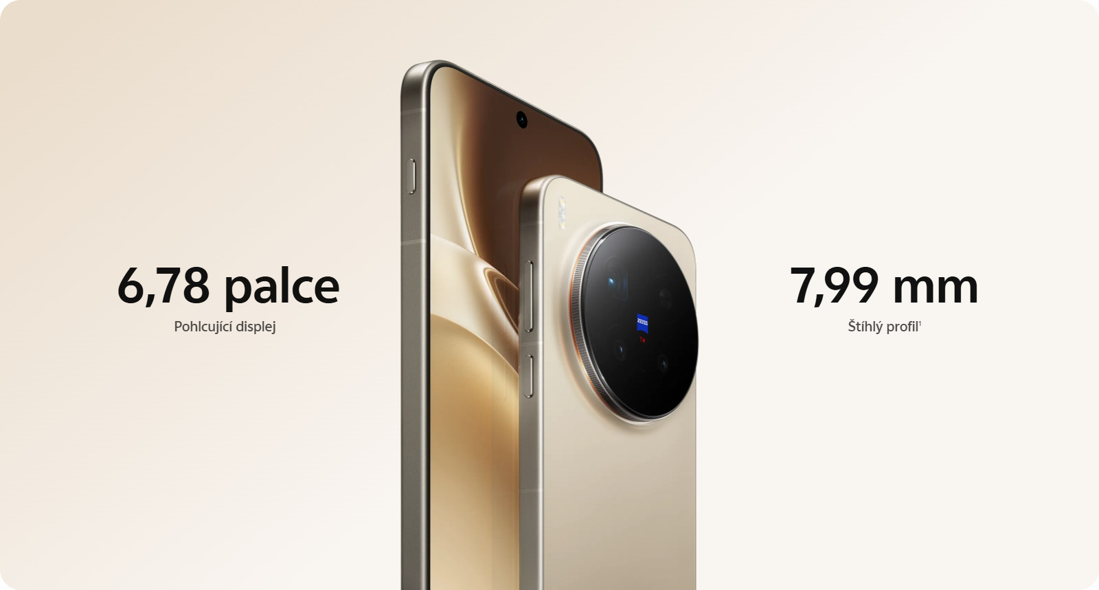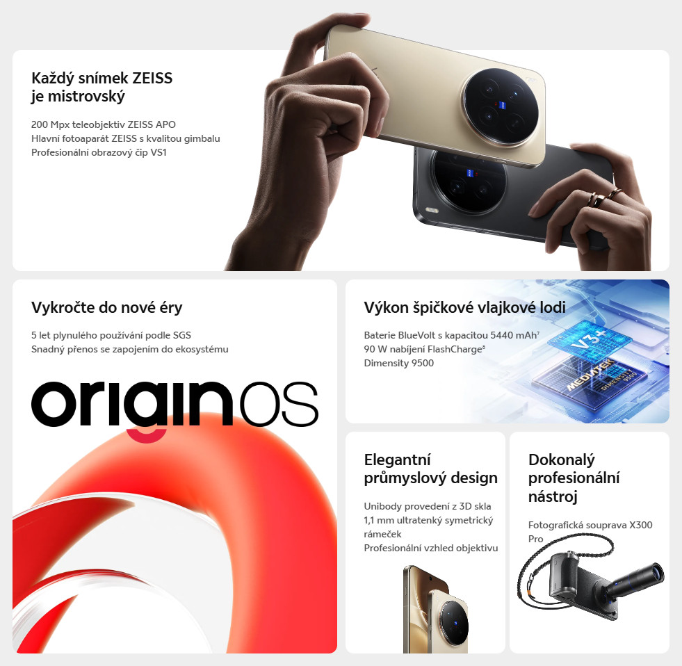 Společnost mu dělají další tři objektivy – 50Mpx ZEISS hlavní kamera, 50Mpx ultraširokoúhlá a 50Mpx přední ZEISS wide-angle.
