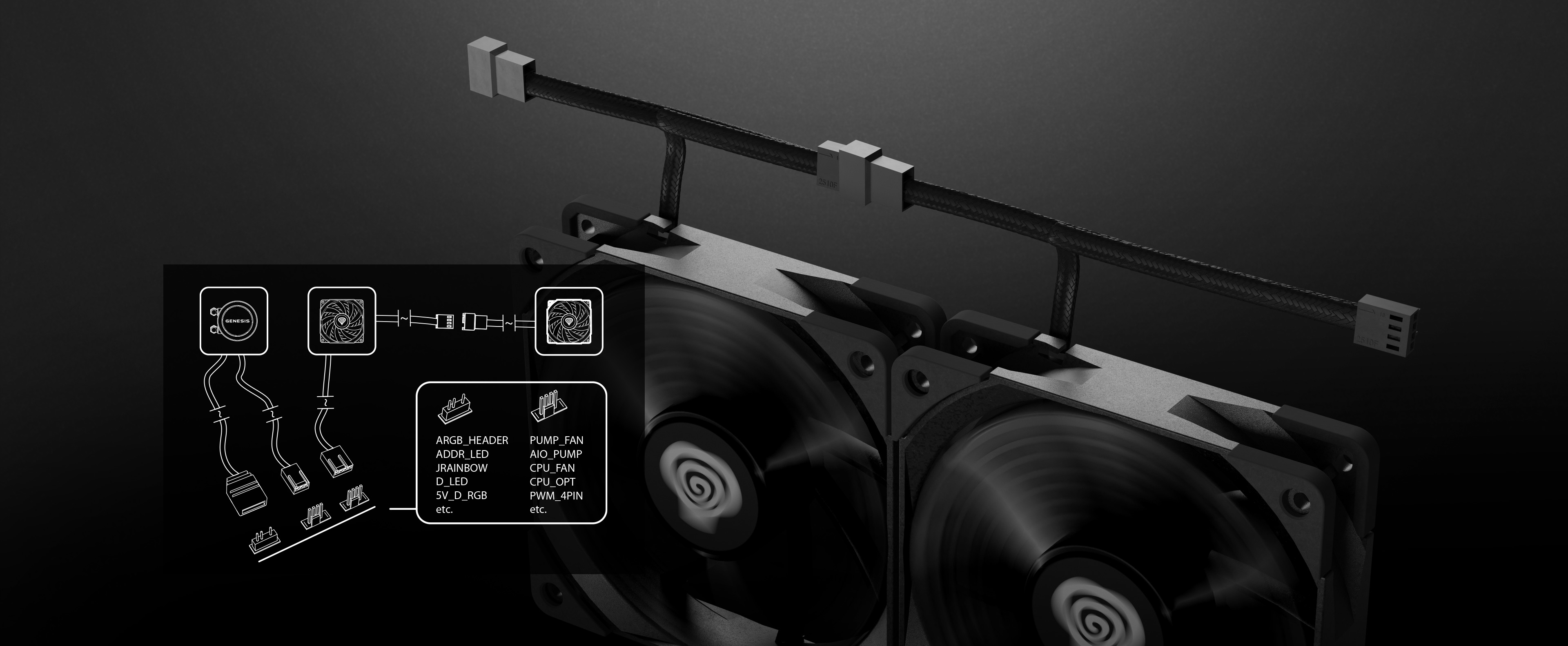 K provozu chlazenà jsou zapotřebà pouze tři konektory - čerpadlo, ventilátory a - volitelně - ARGB, takže instalace je snadná, rychlá a bezproblémová.