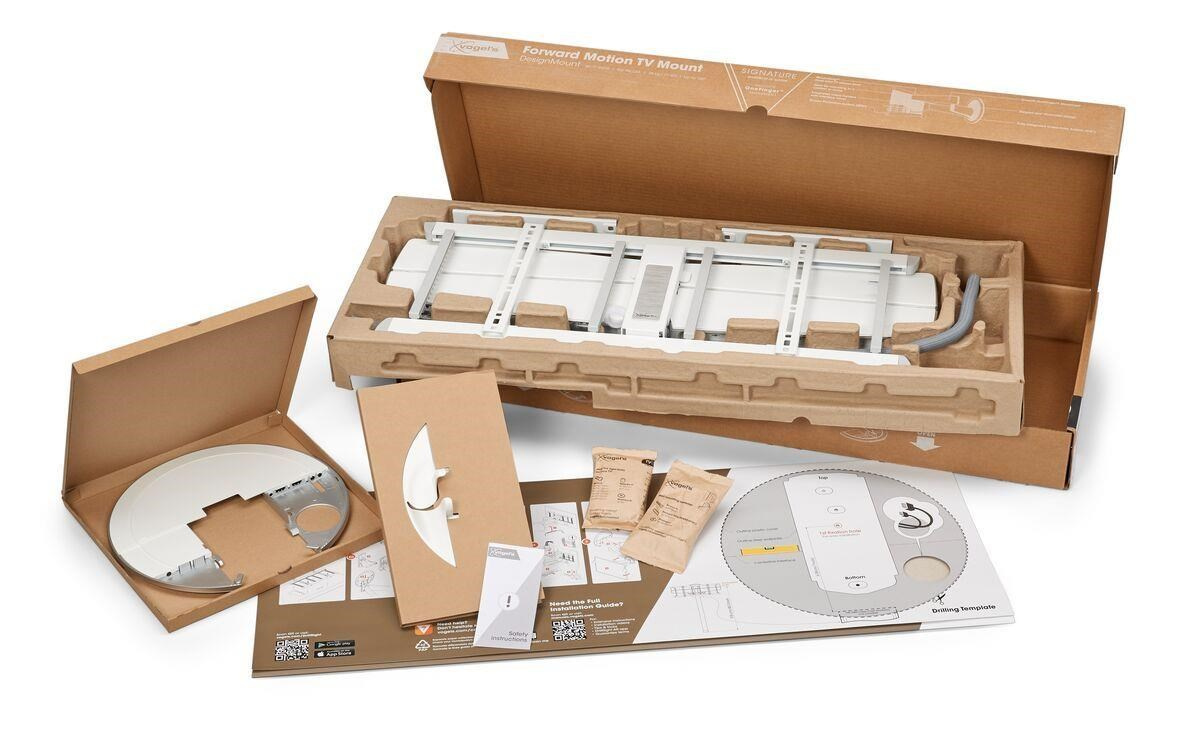 DesignMount se snadno instaluje. Stačí postupovat podle pokynů v přiloženém průvodci rychlou instalací. Nebo si prohlédněte podrobný návod a instalační video online. Součástí balení je vrtací šablona, šrouby a hmoždinky Fischer® DuoPower. Bezplatná aplikace DrillRight™ AR vám ukáže, jak bude TV vypadat v konkrétním interiéru a usnadní vyznačení prvního vrtaného otvoru. A po instalaci můžete televizor snadno vyrovnat.