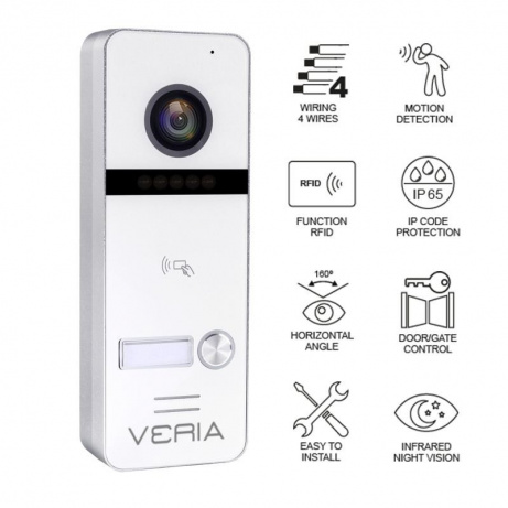 Vstupní kamerová jednotka VERIA 301 je vhodná k propojení s monitory VERIA řady 3xxx. Kamerová jednotka snímá obraz ve Full HD rozlišení, pro noční přísvit používá IR LED diody a pro kvalitní obraz IR Cut filtr. Vstupní stanice disponuje vestavěnou čtečkou RFID čipů 13,56 MHz. Propojení mezi monitorem a vstupní stanicí je 4-vodičové.
