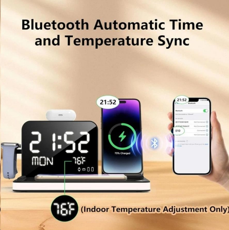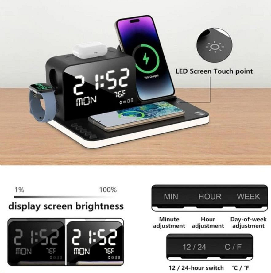WG Multifunkční zařízení 7v1 (hodiny, datum, teplota, nabíječka telefon+hodinky+sluchátka)