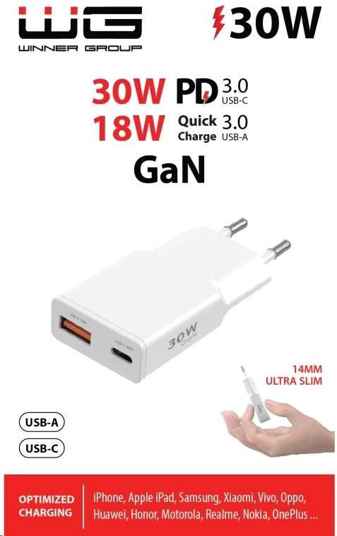 WG - Síťová nabíječka GaN 2x USB, 1x USB-C 30W + 1x USB-A 18W, white, Ultra Slim
