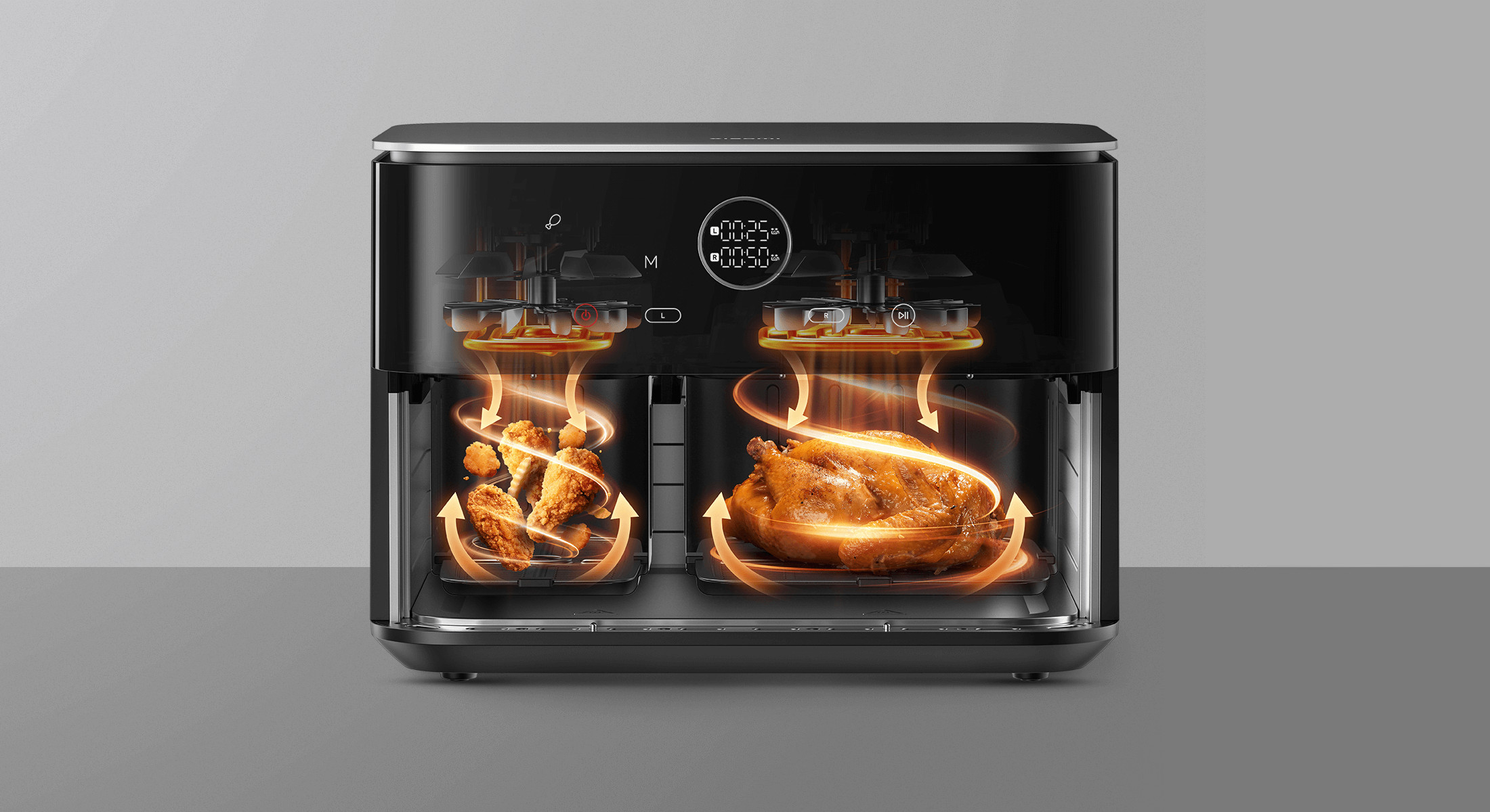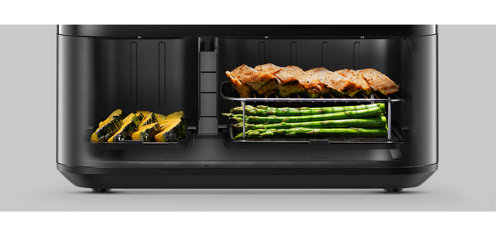360° proud cirkuluje horkĂ˝ vzduch a ohĹ™Ăvá potraviny rychle a rovnomÄ›rnÄ›, coĹľ má za následek kĹ™upavĂ˝ povrch a jemnou strukturu. Vysoce vĂ˝konná horkovzdušná fritĂ©za s pĹ™Ăkonem 2 700 W se mĹŻĹľe pochlubit 71% zvýšenĂm účinnosti vaĹ™enĂ ve srovnánĂ s běžnou troubou.
