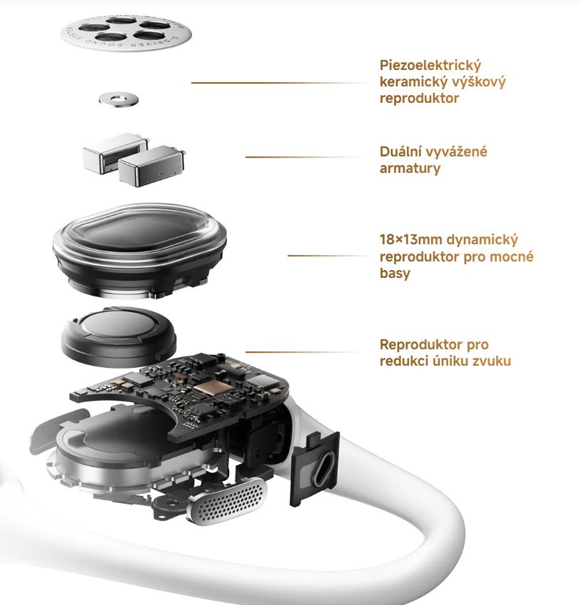 *Speciálně navržený 1813 basový měnič, 2 Hi-Fi vyvážené měniče, 1 piezoelektrický keramický super-výškový reproduktor a 1 jednotka proti úniku zvuku – společně zajišťují přesný a čistý zvuk v celém frekvenčním rozsahu