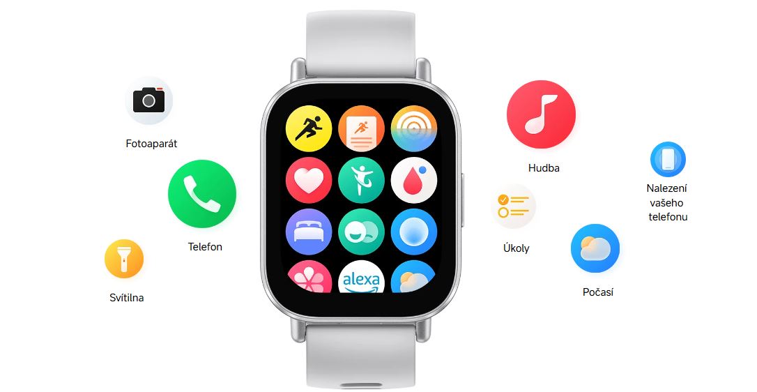 Funkce: Bluetooth calling, 140 + sport modes, blood oxygen, heart rate, sleep & pressure tracking, camera control, Alexa voice assitant and more