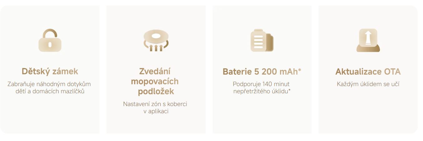 *Extraordinární sací výkon 20 000 Pa díky ventilátoruChytré rozpoznávání koberců s automatickým zvedáním mopovací podložky až o 15 mm