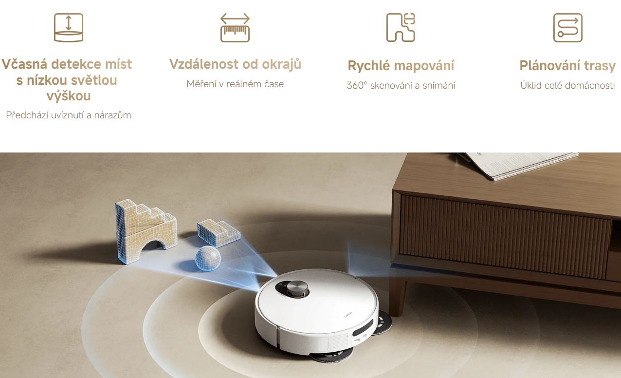 Modul je vybaven zcela novĂ˝m zatahovacĂm laserovĂ˝m navigaÄŤnĂm systĂ©mem. Automaticky se snĂžà pĹ™i detekci oblastĂ s nĂzkou svÄ›tlou výškou a promÄ›nĂ se na velmi Ăşzkou hlavnĂ jednotku, dĂky ÄŤemuĹľ se robotickĂ˝ vysavaÄŤ vejde do oblastĂ s výškou pouhĂ˝ch 9,5 cm. VĂ˝sledkem je ještÄ› účinnÄ›jšà úklid. MinimálnĂ dostupná výška 9,5 cm: RobotickĂ˝ vysavaÄŤ se dokáže dĂky radaru automaticky snĂĹľit a vyÄŤistit prostory se svÄ›tlou výškou 9,5 cm a vĂce. RobotickĂ˝ vysavaÄŤ do tÄ›chto oblastĂ nevjede bÄ›hem mapovánĂ. StandardnĂ oblasti majĂ pĹ™i Ăşklidu prioritu pĹ™ed prostory s nĂzkou svÄ›tlou výškou.
