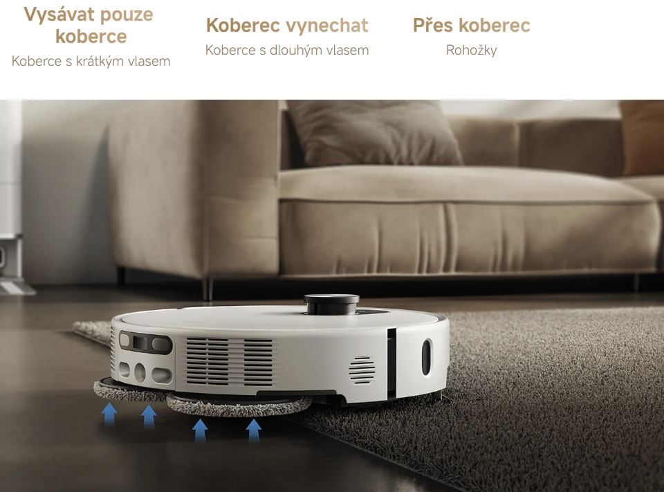 PomocĂ ultrazvukovĂ©ho snĂmaÄŤe podlahy automaticky detekuje koberce a zvedá mopovacĂ podloĹľky o 15 mm, aby nedošlo ke kontaktu. K dispozici je nÄ›kolik reĹľimĹŻ ÄŤištÄ›nĂ pro rĹŻznĂ© typy kobercĹŻ, aby vaše koberce byly dokonale ÄŤistĂ© a zároveĹ suchĂ©.