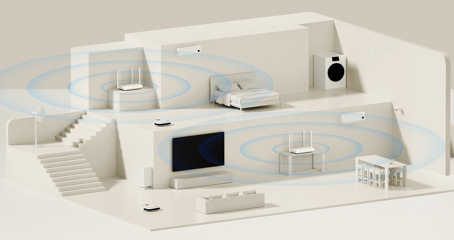Vlastní vyvinutá síťová technologie mesh společnosti Xiaomi podporuje různé hybridní síťové metody, které umožňují připojení až 10 zařízení pro zajištění širšího pokrytí signálem a dosažení bezproblémového přecházení po celé domácnosti*. Pohybujte se volně po domě, aniž byste se museli obávat zpoždění nebo vyrovnávání dat.