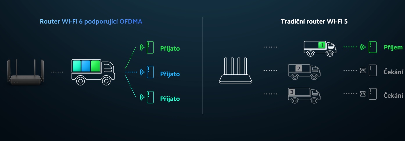 Technologie OFDMA umožňuje vašemu routeru odesílat data do více koncových zařízení pouze jedním přenosem, což přispívá k efektivnějšímu přenosu a snížení latence, takže můžete používat více zařízení současně.