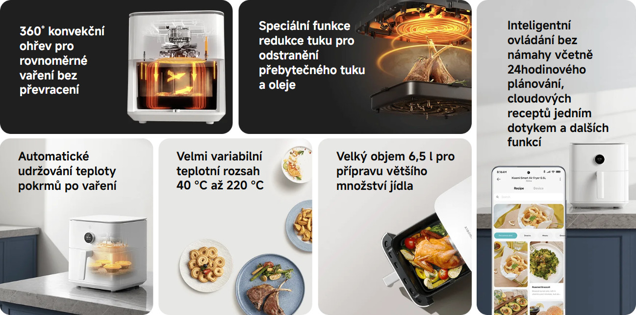 Inteligentní horkovzdušná fritéza Xiaomi Smart Air Fryer 6,5L s chytrým LCD displejem. Kapacita 6,5 l, aplikace Mi Home / Xiaomi Home, max. teplota 220 °C, inteligentní řízení teploty NTC, 30minutový režim ohřívání, funkce odmašťování při vysoké teplotě, 360° konvekční ohřev, 12 přednastavených režimů.