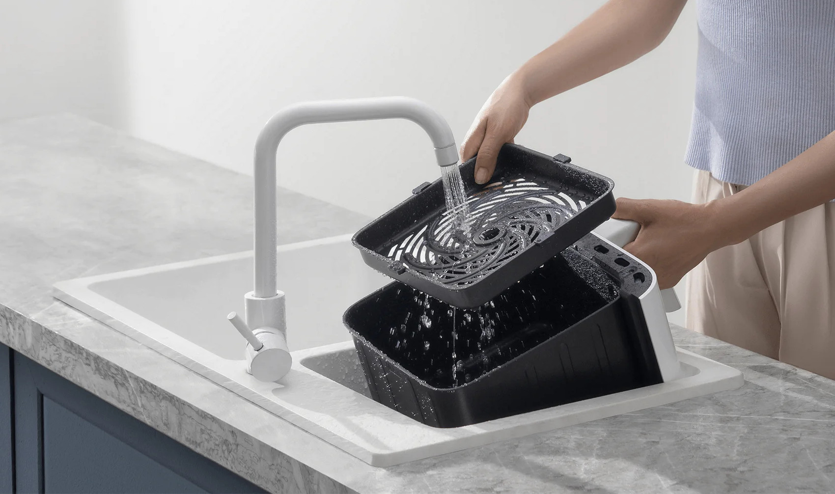 Vylepšený, kruhový vzduchový kanál zlepšuje cirkulaci vzduchu a distribuci vzduchu, posílá horký vzduch přímo do fritovacího koše a zahřívá rovnoměrně bez nutnosti překlápění.